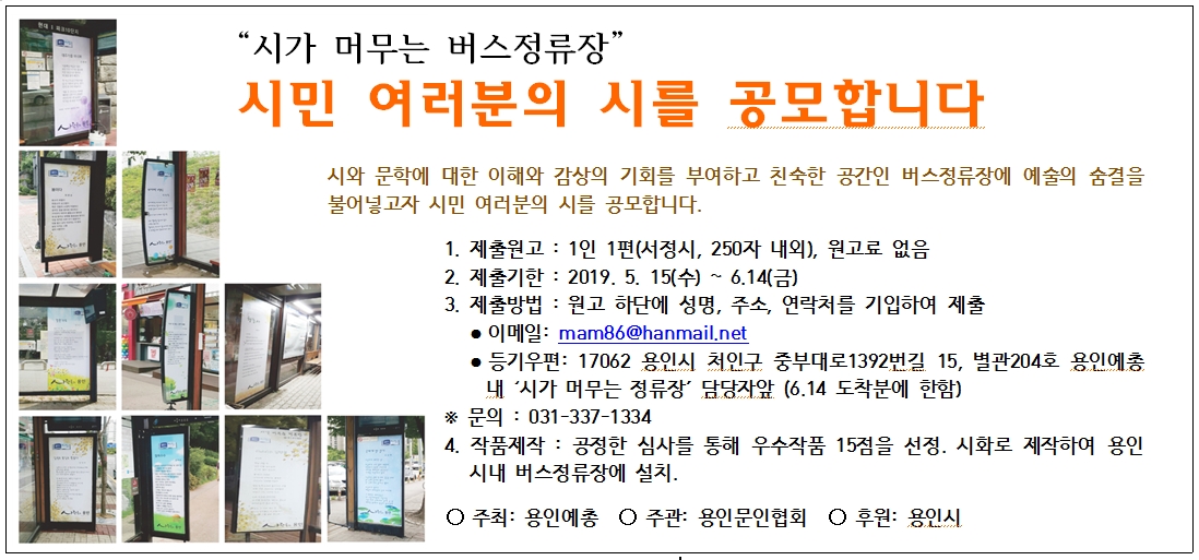 - 시와 문학에 대한 이해와 감상의 기회를 부여하고 친숙한 공간인 버스정류장에 예술의 숨결을 불어넣고자 시민 여러분의 시를 공모합니다.